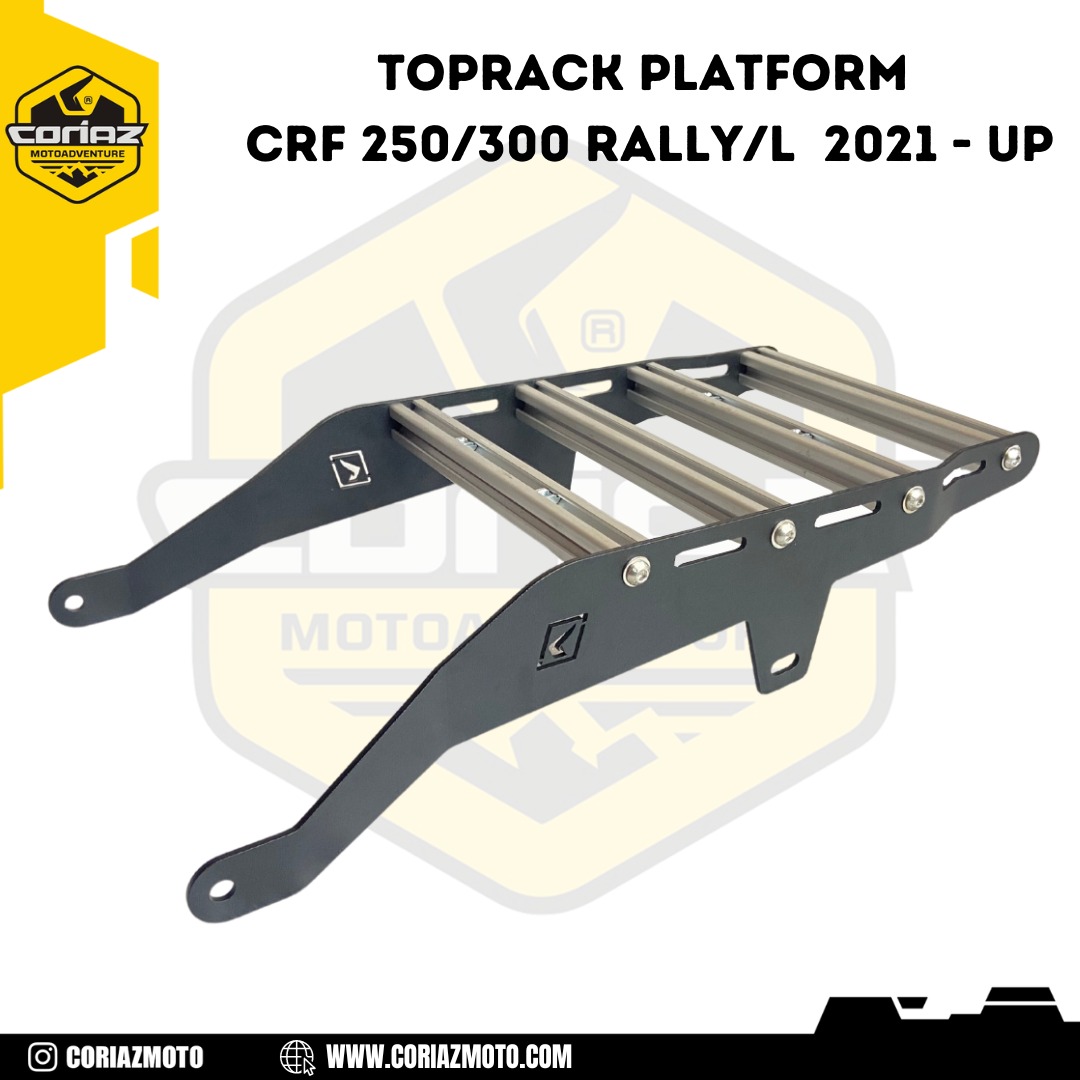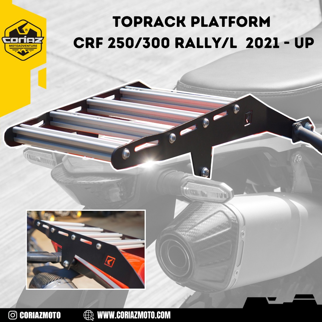 Coriaz Motoadventure menghadirkan paket dengan kombinasi sempurna antara kekuatan, keandalan, dan fungsionalitas. Top Rack Platform CRF 250 Rally/L ini dirancang khusus untuk memenuhi kebutuhan pecinta touring maupun penggunaan harian. Dibuat dari material berkualitas tinggi yang kokoh dan tahan lama, Top Rack ini mampu menopang berbagai jenis barang bawaan mulai dari duffle bag, tas atau sekedar barang bawaan dengan bagasi tambahan kurang lebih hingga 20 kg.