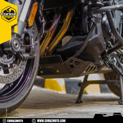 Dibekali skidplate original dari pabrikan dengan ketebalan hanya 2mm mungkin cukup hanya untuk pemakaian harian di jalan mulus, tapi tidak saat mulai masuk medan berbatu, jalur tanah, atau touring jarak jauh sehingga perlindungan setipis itu jelas tidak bisa diandalkan.