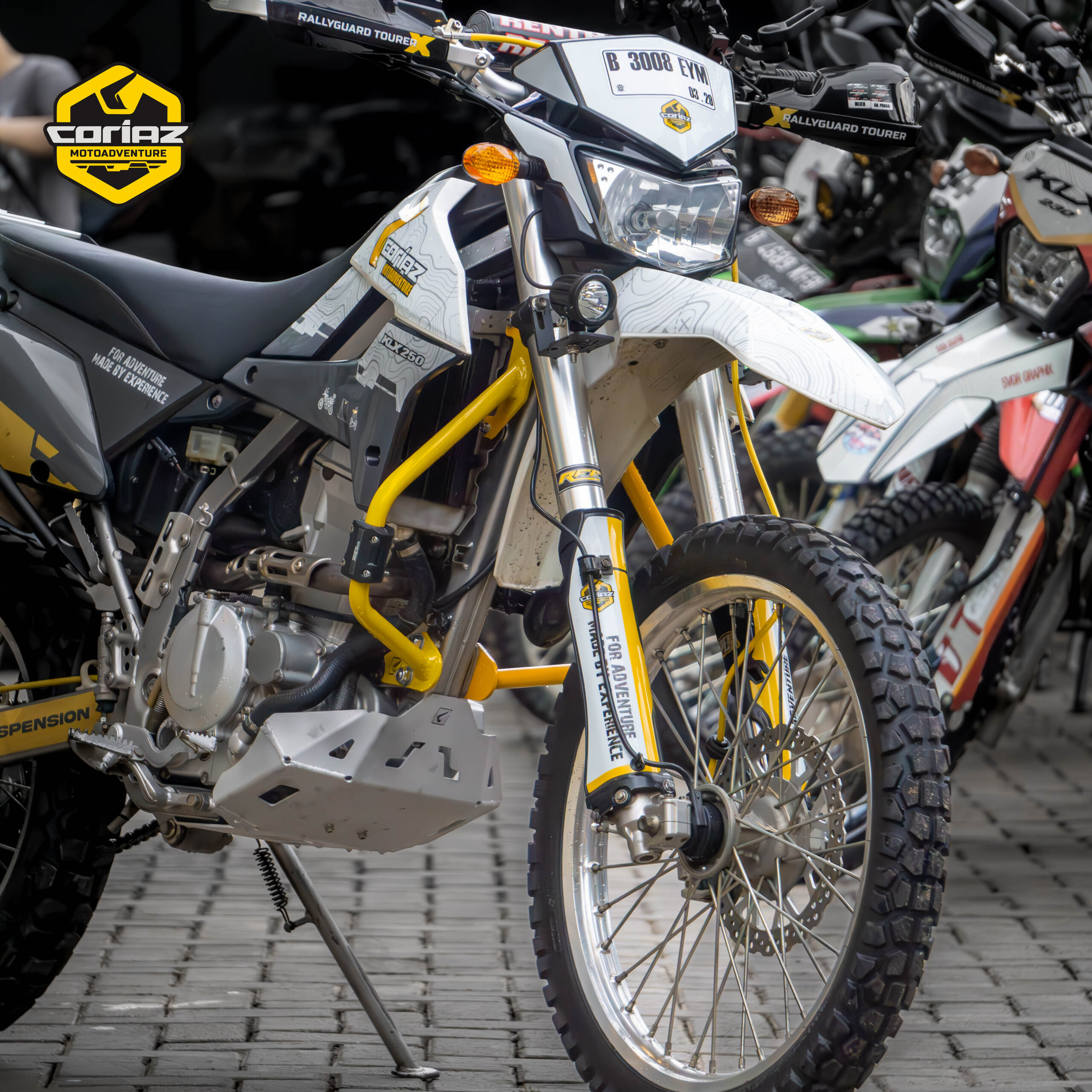 Skidplate Coriaz hadir dengan ketahanan maksimal untuk melindungi bagian bawah mesin motor Anda dari segala benturan dan gesekan saat berkendara di medan berat, ringan maupun harian. Berbahan dasar aluminium 5052 setebal 3mm yang dikenal kuat dan ringan, skidplate aluminium ini dipotong menggunakan teknologi CNC Laser Cut untuk memastikan akurasi dan kesesuaian sempurna dengan rangka motor Kawasaki KLX 250.